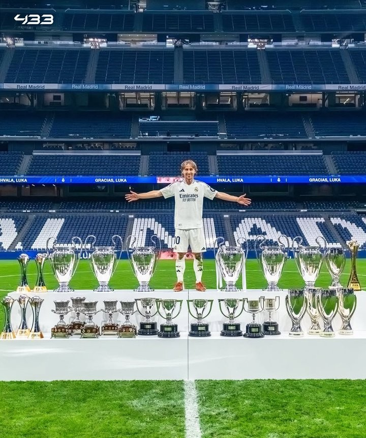 莫德里奇在皇马赢得了28座奖杯,是俱乐部历史上个人夺冠次数最多的球员。他的奖杯包括创纪录的6座欧冠冠军、4座西甲冠军和1座打破梅罗十年垄断的金球奖。