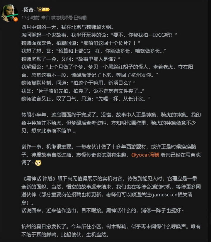 杨奇则在微博中说明了新作选择钟馗的原因,古有唐玄宗病梦钟馗捉鬼,今有杨奇怪梦钟馗骑虎,“创作之事机缘很重要”既然机缘到了,便该联系老伙计们新建文件夹了,正如二人做黑猴的一拍即合,挠头皮苦思DLC的冯骥也总算是能腾出大脑面对这个新点子,与其状态不好缺少灵感巧思的情况下硬做DLC,不如清空大脑心态轻松的面对新的神话,到时候再回头看自己的老伙计悟空,想必也会有新的奇思妙想吧~