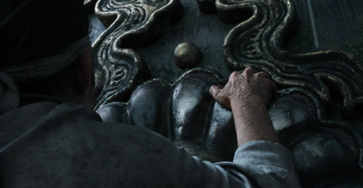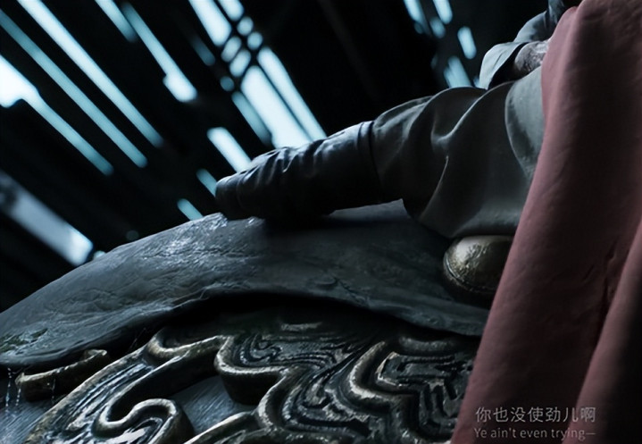 身着红色布衣的人喘着粗气向上攀爬,在一装饰精美的墙面上攀爬,从墙面花纹纹路的精致和故意做旧的痕迹明显看得出来,游科大赚一笔后技术又进步了,镜头拉远的同时看到他攀登的并不是一堵墙,上方有皮质的反光开口还缠满蛛丝,似乎是一个饱经风霜的物件,物件的顶端是一个平面,他攀爬到顶翻腿而上还脚滑了一下,反光皮质的部分还回弹了一下,再加上他腿下的铆钉部分,总算能确认物件居然是一个巨大的鼓,那么什么鼓大到需要人来攀登呢?我们可以反向思考,阴雨连绵春意盎然再加上一个鼓,和24节气中惊蛰的习俗“蒙鼓皮,打小人,祭白虎”相对应,所以并不是鼓变大了,而是鼓面上的两人是“小人”。