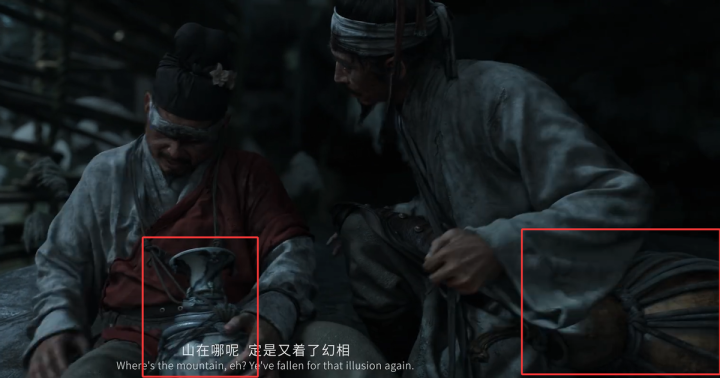 “山在哪呢?定是又着了幻相”“只要心中有山,大王随时能让我们回去”“没打没骂免了死罪,不回去的好”核心的三句话隐藏了很多信息,乍一看似乎没什么逻辑,但二人手中还各有一奇特之物,一物似宝玉瓷瓶,一物葫芦似乎不凡。其中一人对那宝玉瓷瓶甚是小心,抱在怀里生怕磕碰,若是凡物肯定没有出现的必要,像他俩在钟馗现身前说的那句”有吃有喝还有……”,还有什么呢,还有法宝。