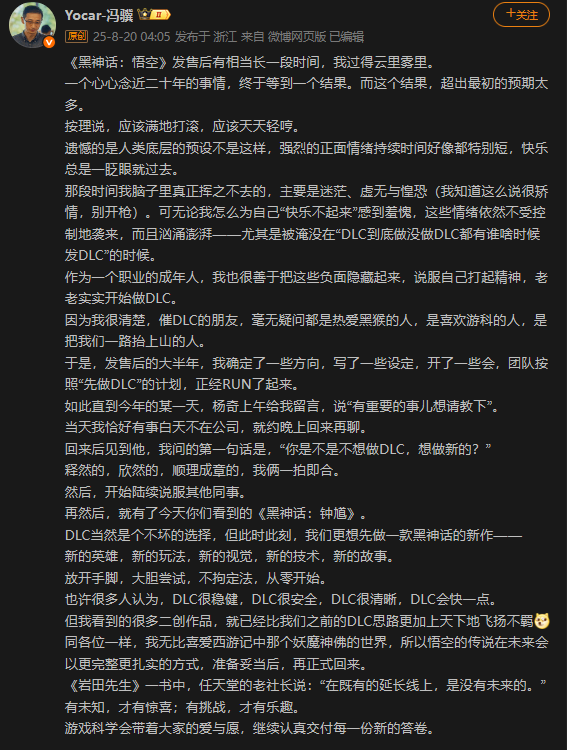 不过很显然,冯骥和杨奇并没有初生牛犊不怕虎的冲动,他们是真的认真思考才做的决定,从冯骥发布于微博的动态中两人的心思也写的明明白白,冯骥在黑猴成功短暂的喜悦之后冯骥陷入了迷茫和虚无,黑猴的成功是现象级的,天时地利人和将这个游戏托举到了一个超过预期太多的高度,被万人催更的口水淹没中,冯骥开始惶恐,开始怀疑自己能否担得起DLC的水平。这种感觉就像是小说作家一本书突然爆火,开新坑时担心自己的新作不合读者胃口,更别说粉丝基数如此之大的黑神话悟空。