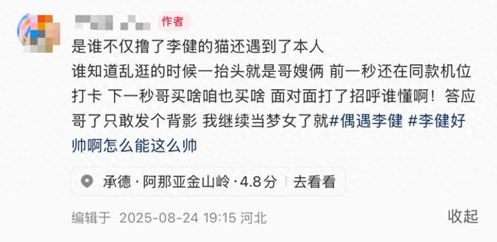 8月24日晚,有网友在社交平台发文,称“是谁不仅撸了李健得猫还遇到了本人,谁知道乱逛得时候一抬头就是哥嫂俩,面对面打招呼了”,该网友本身就是李健的歌迷,没想到在阿拉亚遇到了正主本人。
