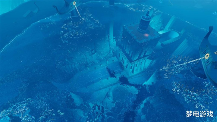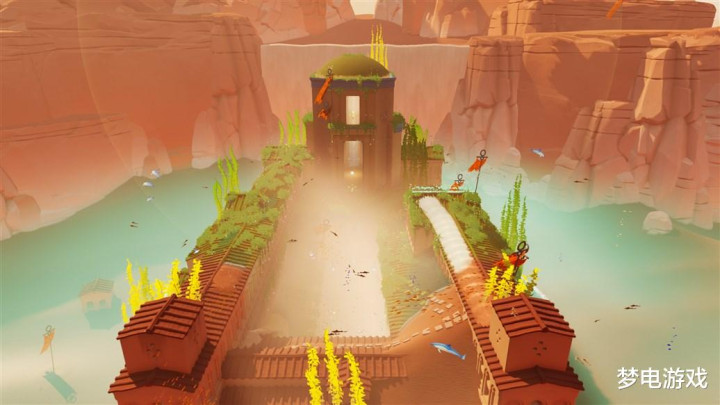 震撼的视觉体验在于,一些印记互动后地形的改变。沙漠与海洋的并存;失落的遗迹里却布满了生机的颜色;海草在沙子、岩石、土地中茁壮生长;鱼群、海豚、鲨鱼、海龟游荡于天空之上。