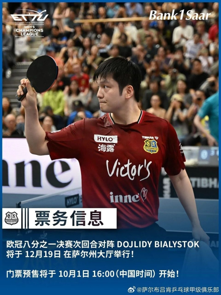9月29日,萨尔布吕肯俱乐部发文:本周三16:00(中国时间)正式开票!这将是樊振东职业生涯的首场欧冠比赛——在萨尔州大厅现场举行!