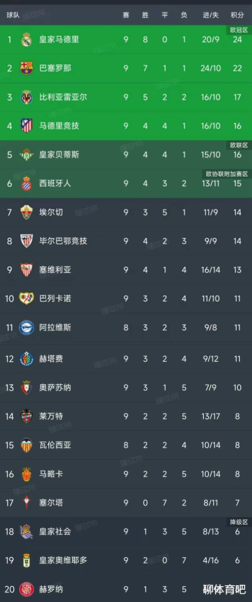 北京时间10月20日,西甲第9轮除了阿拉维斯和瓦伦西亚的比赛还没有进行,已经结束了9场比赛,我们一起看看最新积分榜变动!