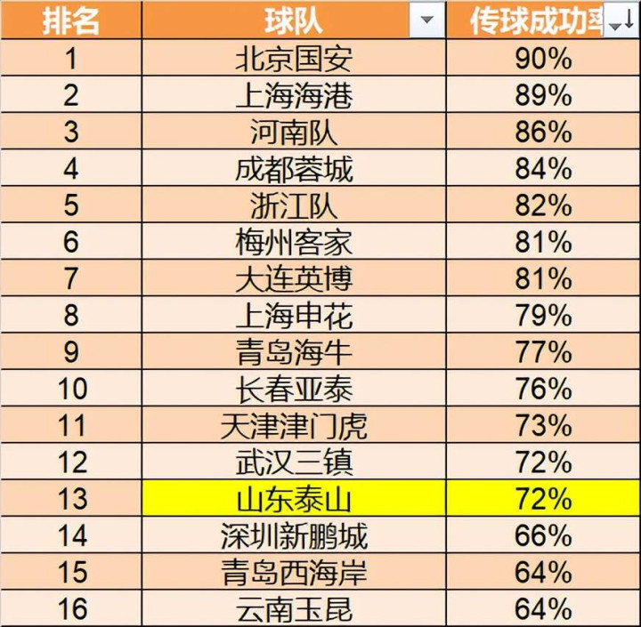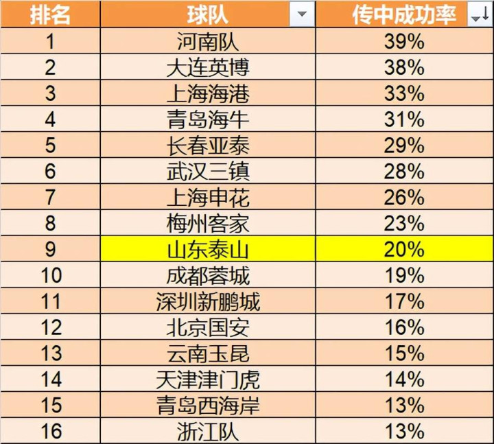 19.本轮山东泰山的长传成功率是41%,中超第8位。