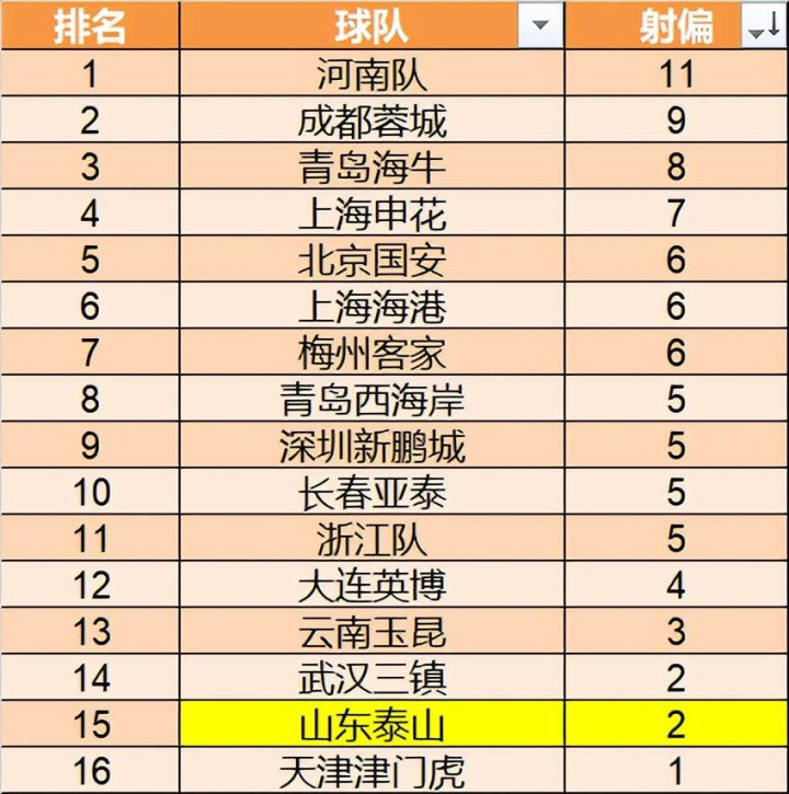 16.禁区外射门山东泰山1次,中超最少。河南队8次,中超第二。