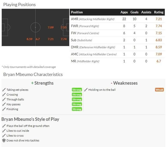 身高1米71,体重68公斤,姆贝莫不仅可以凭借敦实的身体赢得一对一,还总能依靠令人咋舌的柔韧性完成极限动作。由于爆发力和重心控制能力都非常出色,姆贝莫的控球和护球很有把握,扛着对手完成传球和射门的画面屡见不鲜。由于很多进攻选择都比较激进,姆贝莫也是英超赛场上丢失球权最多的球员之一。