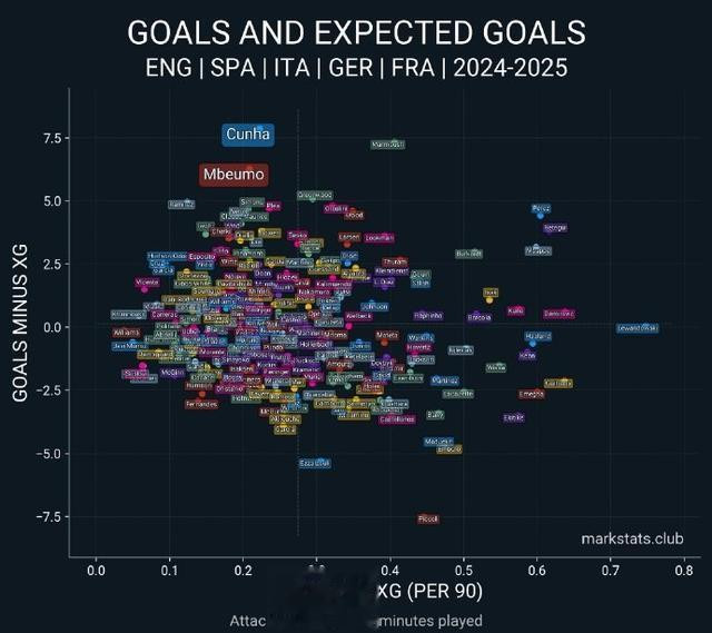 2024/25赛季的英超联赛,曼联在38场比赛中仅斩获44球,进攻效率之低史上罕见。齐尔克泽、霍伊伦和加纳乔总计只参与了16粒进球,远远落后于姆贝莫(27球)。由于布伦特福德的总体实力有限,锋线球员得到的机会不会太多,姆贝莫每90分钟内获得的绝对机会数在五大联赛攻击手中处于相对靠后的位置,转换为进球的能力却处于顶尖一档,曼联买到了当今欧洲足坛最为高效的终结者之一。