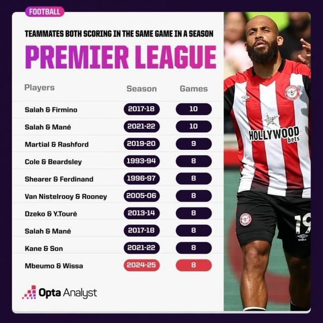 2024/25赛季,姆贝莫在38场英超联赛中全部首发,录得20球7助攻,位居射手榜第4位,参与进球数(27)仅次于萨拉赫(47)和伊萨克(29),高于哈兰德(25)和布鲁诺-费尔南德斯(18)。此外,姆贝莫还送出202次传中,成为了英超赛场上送出传中最多的球员。