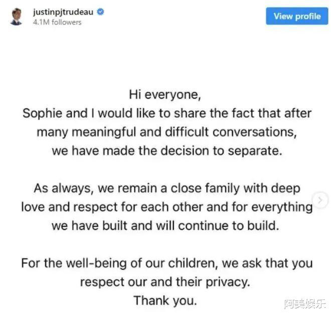当时特鲁多正在任期上,按照惯例不会分手,没想到这两人很决绝,2023年8月,特鲁多直接发了分居小作文↓↓