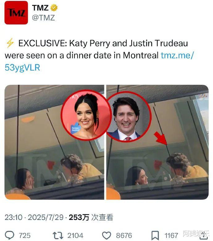 今天的八卦破次元壁了!水果姐凯蒂·佩里和加拿大前总理特鲁多约会,两人在加拿大蒙特利尔约饭被拍到↓↓