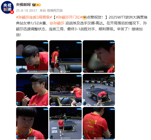据央视新闻消息,2025WTT欧洲大满贯瑞典站女单1/32决赛,孙颖莎迎战埃及选手汉娜·高达。在开局落后的情况下,孙颖莎迅速调整状态,连扳三局,最终3-1战胜对手,顺利晋级。