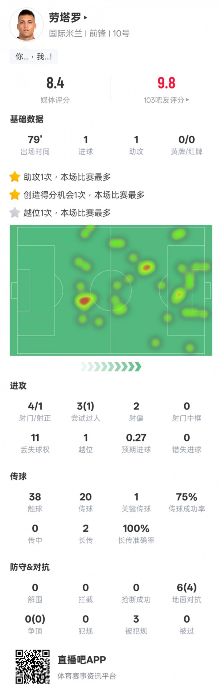 劳塔罗本场比赛数据: