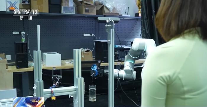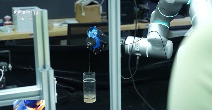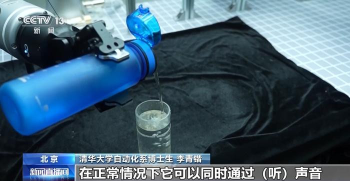 清华大学自动化系博士生李青锴:我们运用了多感知,它在正常情况下可以同时通过听声音和看画面来完成倒水,通过我们的模型设计,让它能够比如在声音受干扰的情况下,如果看画面有效,它可以通过看画面来完成倒水,或者如果看画面受到了干扰,这个时候它可以完全靠听声音来倒水。