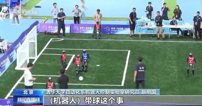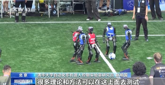清华大学自动化系机器人控制实验室研究员赵明国:具身智能里的很多理论和方法可以在这上面去测试。对踢足球这个场景来讲,两个机器人能不能传球,我觉得这个挑战是目前最大的,现在大家看到的传球是机器人无意识的,就是碰巧了它在跑位。