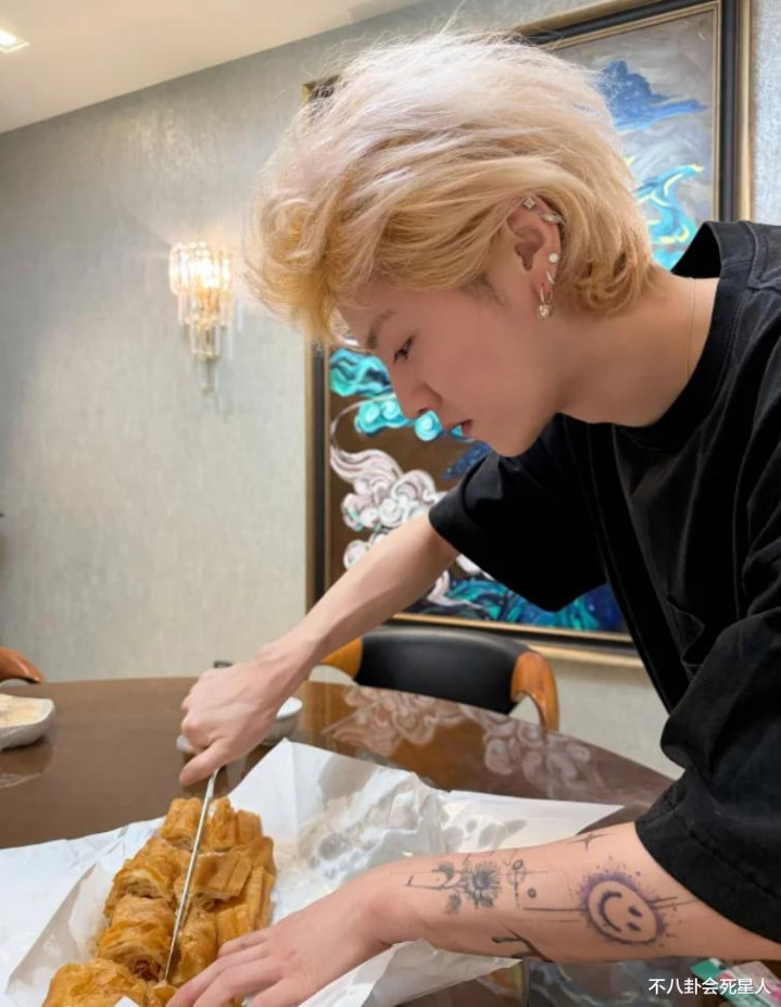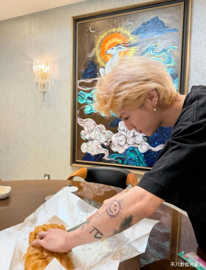 鹿晗正拿着长刀切着类似油条的食物,胳膊上的多个刺青一览无遗,这些纹身几乎都与粉丝和演唱会有关,那个π、向日葵的图案,一个是个人巡演时的主题,另一个则是代表着粉丝是他的“阳光”。