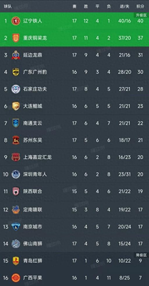 辽宁铁人双杀重庆铜梁龙,连续15轮不败,以40分领跑积分榜。重庆铜梁龙虽然没能复仇,但以37分还是稳居第二名,领先了身后的对手6分以上,主要能战胜其他对手,守住前两名,同样能够冲超。