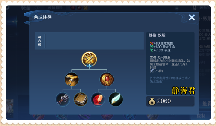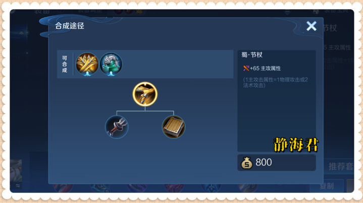 对了,雌雄-双股的合成途径是蜀-节杖+玛瑙护心镜,蜀-节杖的属性是+65主攻属性。对照820金可以买到的大棒(+120法术攻击),800金的蜀-节杖性价比显然更高人,如果能合成其它装就更好了。