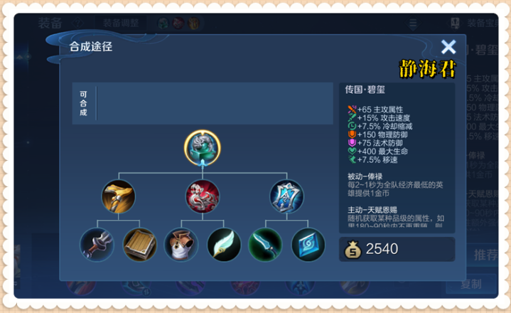 这里的1主攻属性=1物理攻击力=2法术攻击力,也就说是说如果是法师出的话,获得就是160点法强+600生命+7.5%移速和一个位移效果。