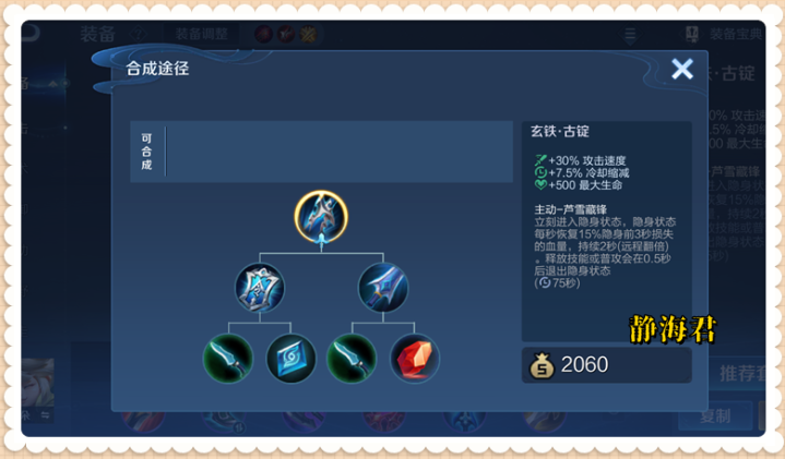玄铁-古锭可以提供攻速、最大生命值、隐身和恢复效果,且远程英雄在使用这件装备时还能获得双倍的隐身时间,综合这些情况,很显然策划的初衷是想为射手设计一件保命装。