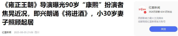 红星新闻——《《雍正王朝》导演曝光90岁“康熙”扮演者焦晃近况,即兴朗诵《将进酒》,小30岁妻子照顾起居》2025-8-5