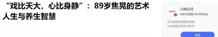 北晚在线——《“戏比天大,心比身静”:89岁焦晃的艺术人生与养生智慧》2025-7-26