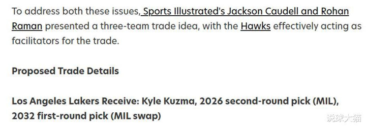 湖人:库兹马+2032首轮互换权利(来自于雄鹿)+2026次轮签(来自于雄鹿)