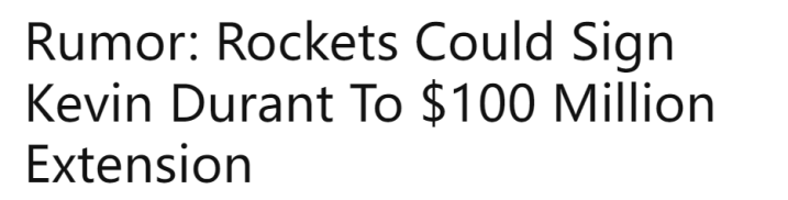 “杜兰特当前的合同还剩一个赛季(价值5470万美元)。尽管他可能不会在7月具备续约资格时就签下续约合同,但球队消息人士表示,大家坚信这将是一段长期的合作关系。从理论上讲,火箭队的前景看起来极为光明。”