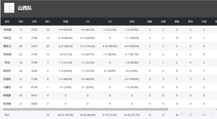 这场比赛翟若云出战33分钟,21中6,三分10中4,罚球4中4,拿到20分6篮板2助攻1抢断,命中率28.6%,三分命中率40%,她个人得分占比全队28.6%,可以说27岁的翟若云是付出一切。