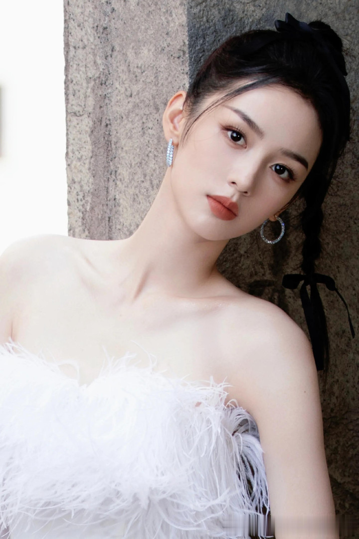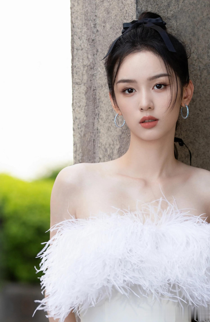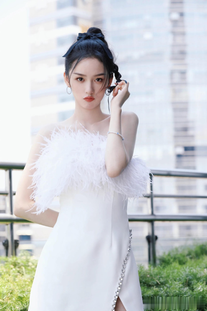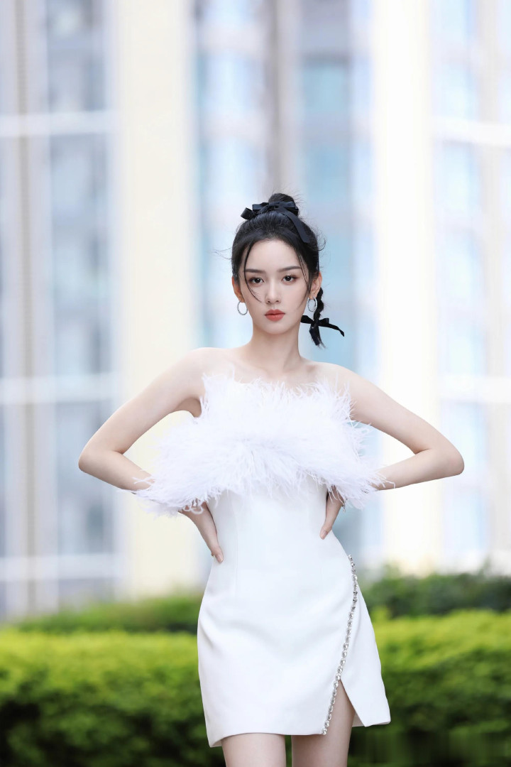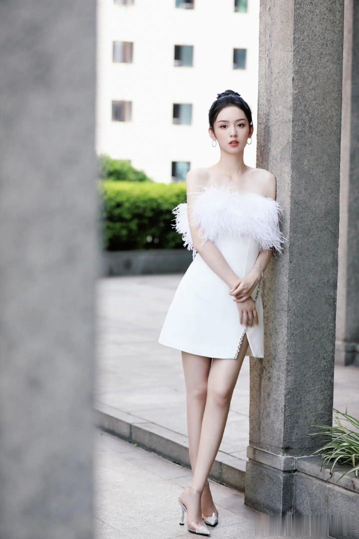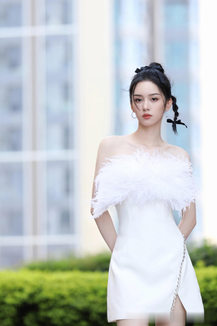 周也一字肩羽毛裙, 甜美与优雅并存