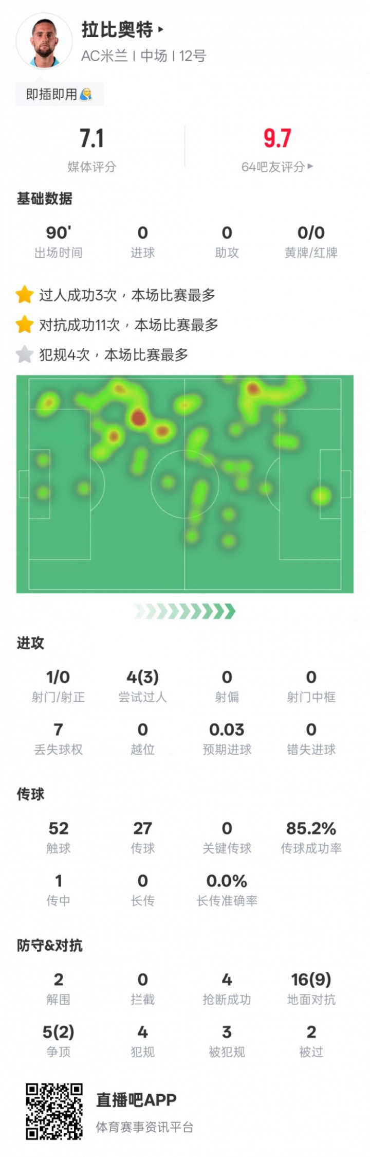 直播吧9月15日讯2025-26赛季意甲联赛第3轮,AC米兰1-0战胜博洛尼亚,拉比奥特首发出战,11次对抗成功全场最高,3次过人也是全场最多,评分7.1。