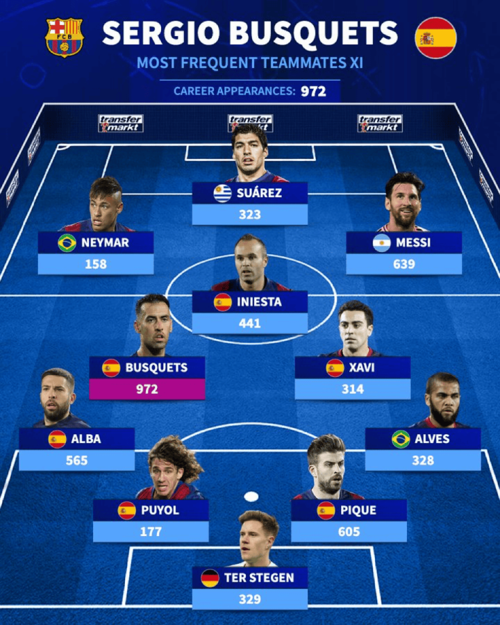 虎扑09月26日讯布斯克茨宣布将在本赛季结束后退役,德国转会市场盘点了他在职业生涯联袂出场次数最多的队友。