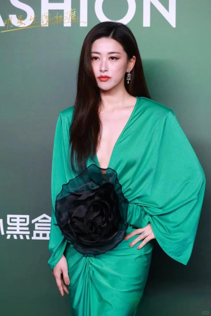 前段时间穿着深V的绿色长裙,眼神狠厉又很酷飒。