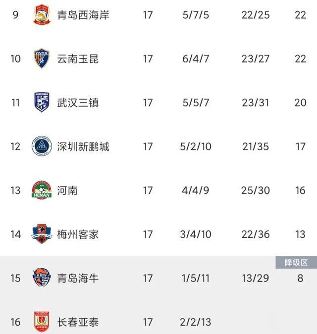 中超联赛进行了17轮,现在降级区的2支球队依然是青岛海牛与长春亚泰。目前赛程已经过了大半,但这2支球队仍然没有太大的起色,现在他们的保级压力还是最大的。尤其是青岛海牛最让人揪心,尽管他们引进了新外援兰克尔-泽,但现在还是很难拿分。值得一提的是,法比奥依然以12球排名射手榜第1位。